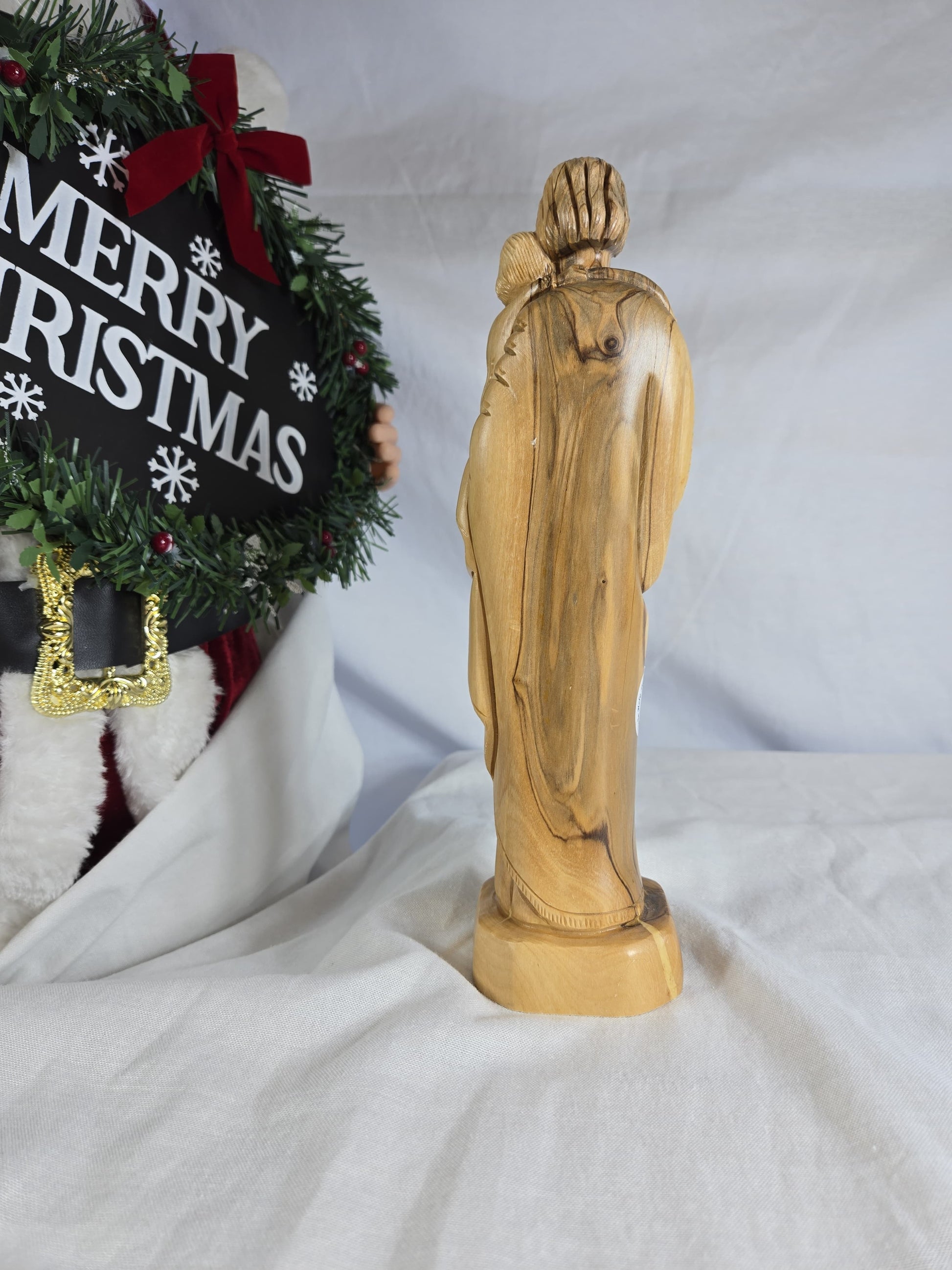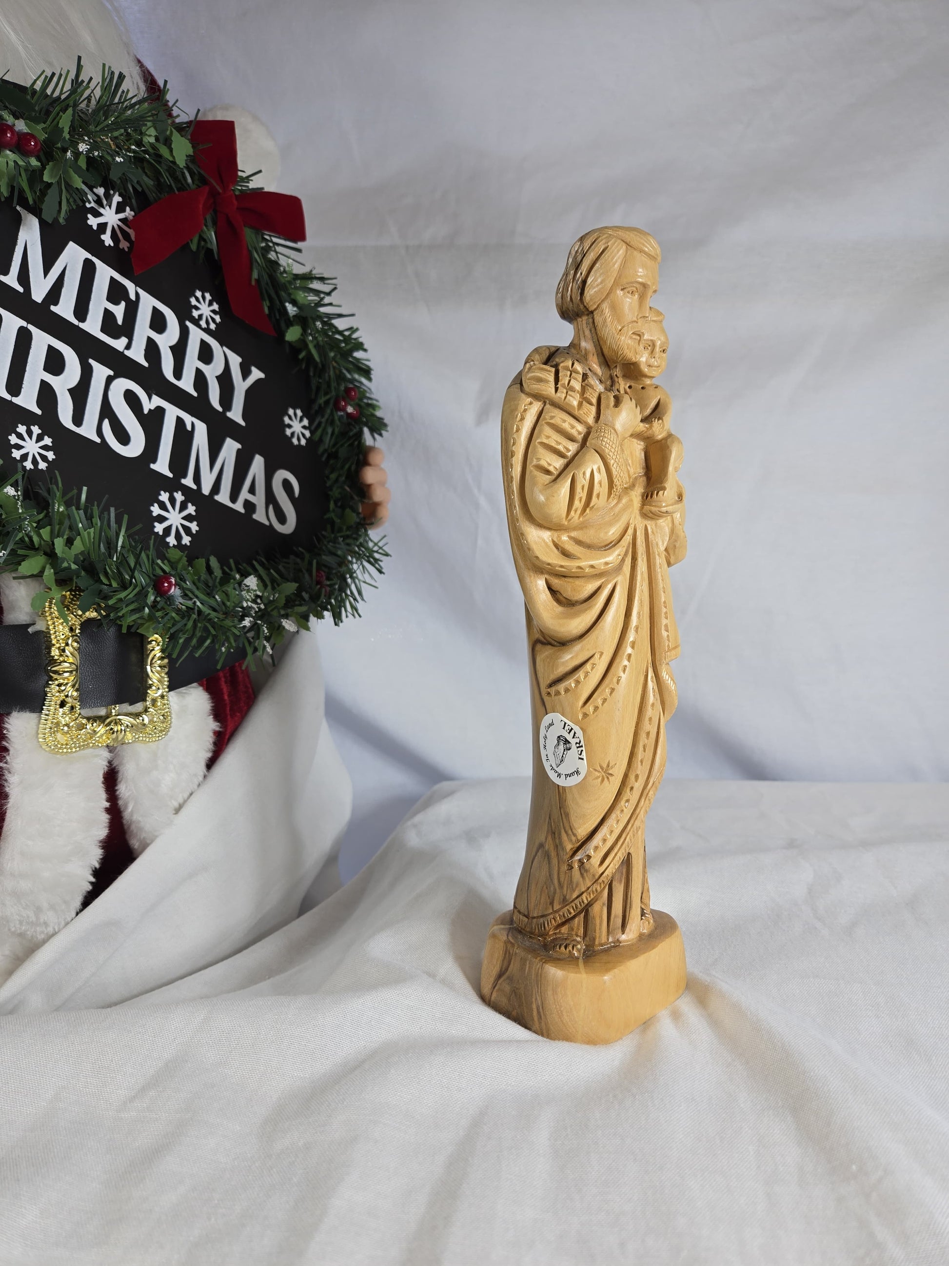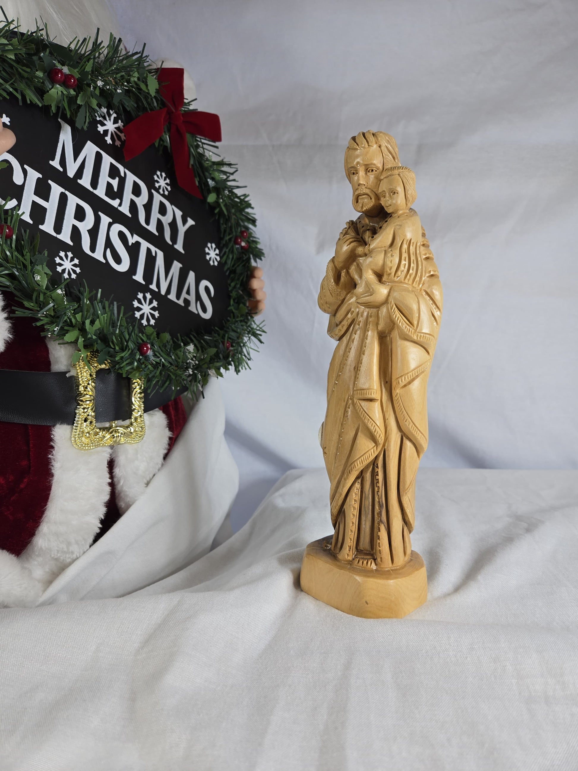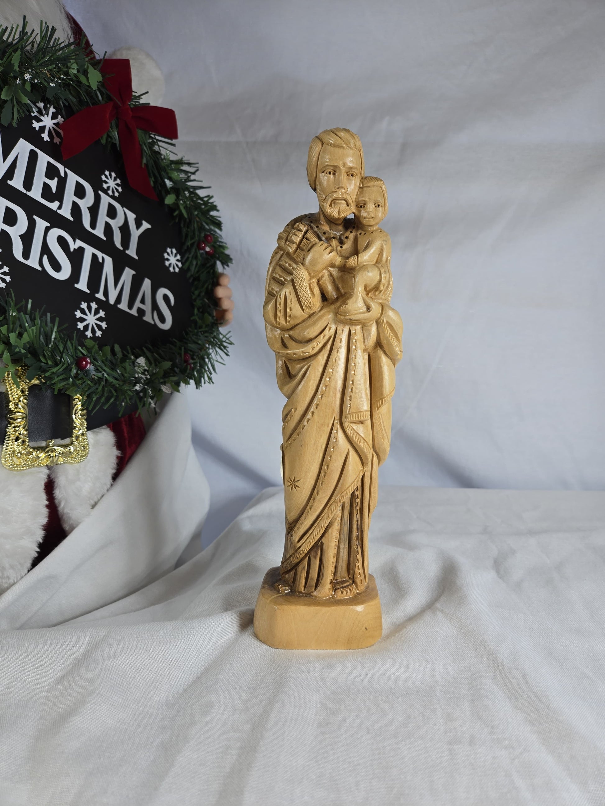 This is a hand-carved olive wood statue depicting Saint Joseph holding Baby Jesus. Handcrafted by Christian artisans in Bethlehem, using genuine olive wood sourced from the Holy Land. Represents love, faith, and protection, often featuring lilies as a symbol of purity and chastity. Made from aged olive wood, often from a single piece, with variations in wood grain and color making each piece unique. Suitable for enhancing prayer spaces, mantels, or shelves.