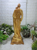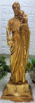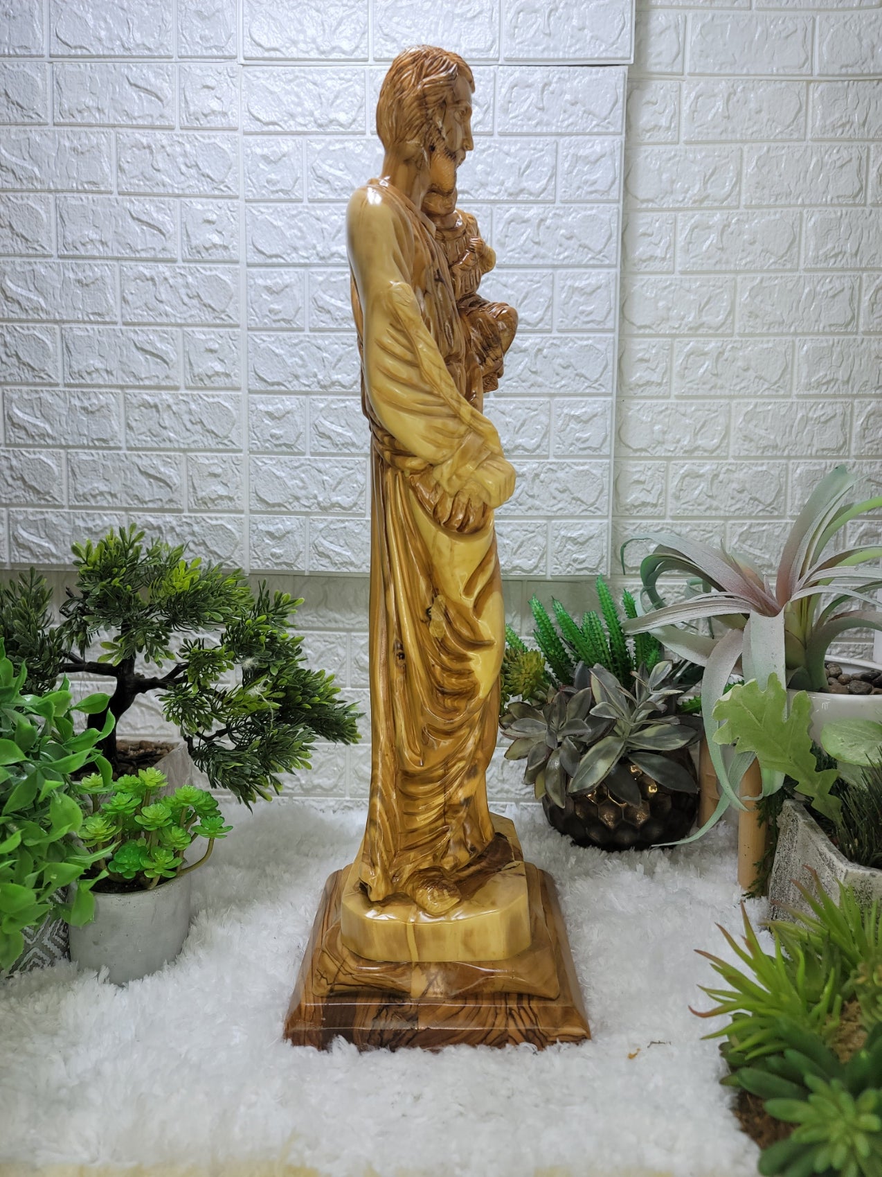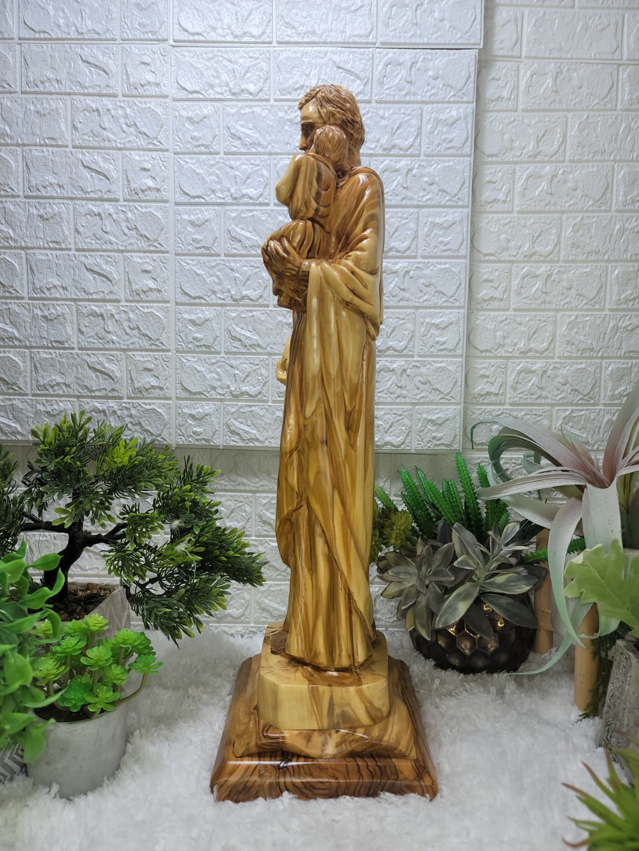 This is a hand-carved olive wood statue depicting Saint Joseph holding Baby Jesus. Handcrafted by Christian artisans in Bethlehem, using genuine olive wood sourced from the Holy Land. Represents love, faith, and protection, often featuring lilies as a symbol of purity and chastity. Made from aged olive wood, often from a single piece, with variations in wood grain and color making each piece unique. Suitable for enhancing prayer spaces, mantels, or shelves.