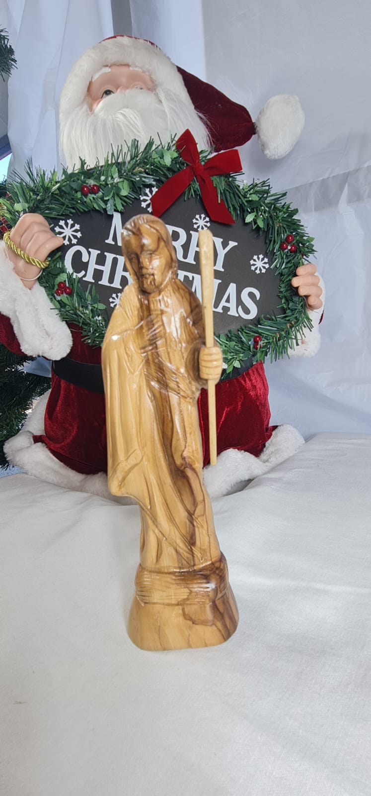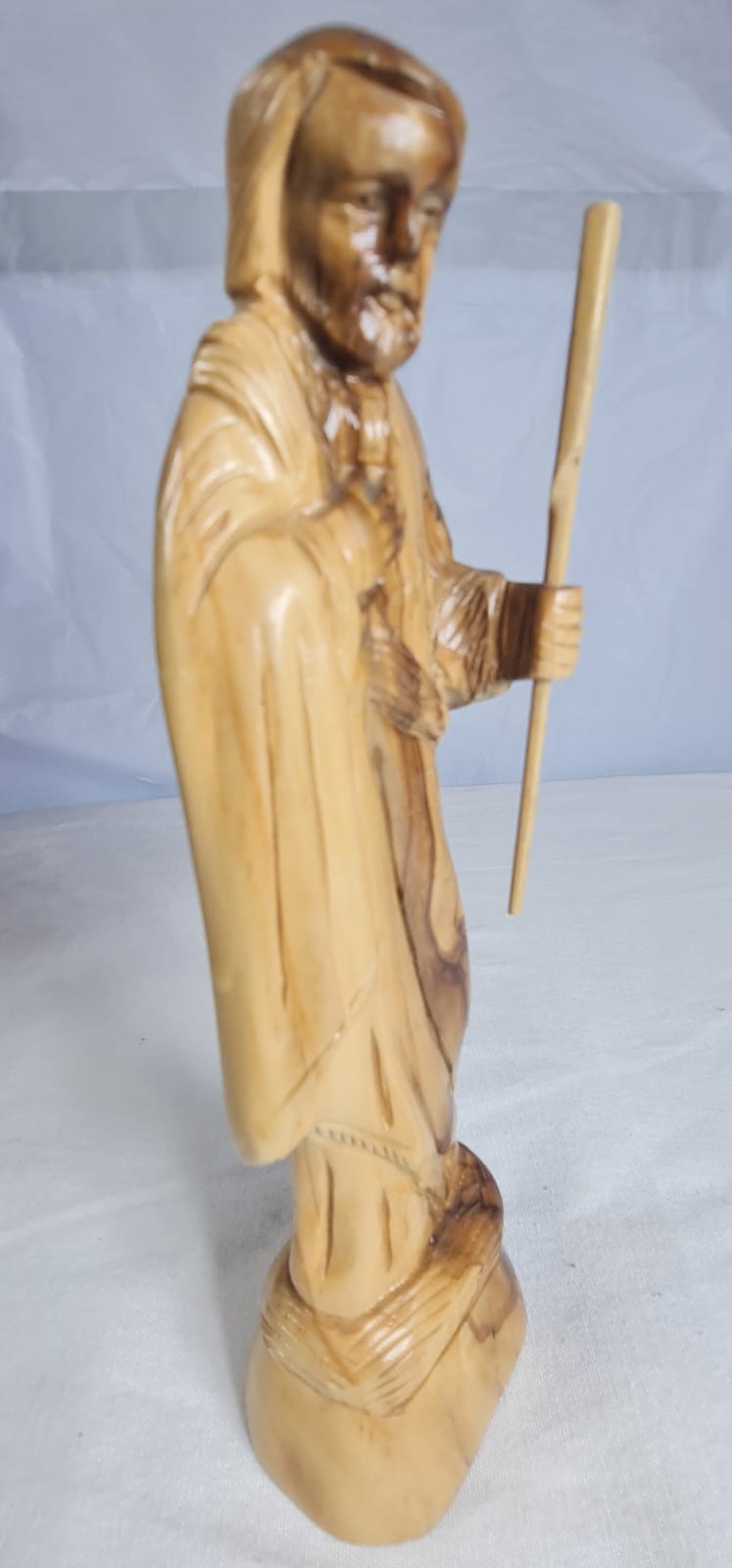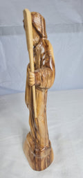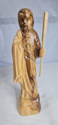 This is an olive wood statue depicting Christ the Good Shepherd. Hand-carved from olive wood, likely sourced from Bethlehem. crafted by artisans in the Holy Land, particularly Bethlehem.