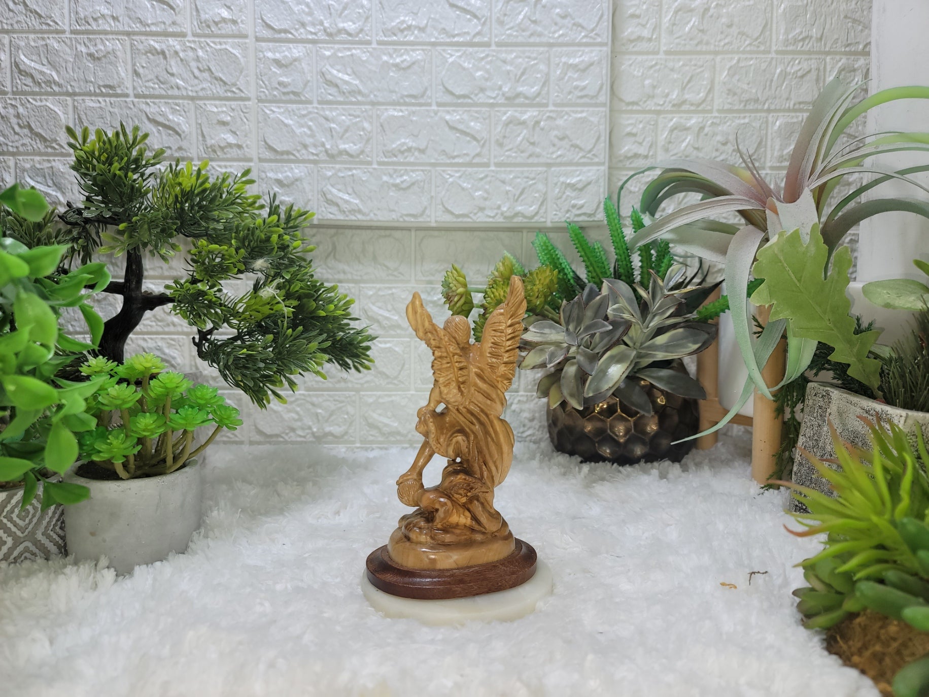 This hand-carved olive wood statue of Saint Michael the Archangel, crafted in Bethlehem in the Holy Land. The statue depicts Saint Michael defeating Satan, symbolizing the Archangel's role as a warrior against evil. It is made from olive wood sourced from trees in the Holy Land, with some pieces potentially from trees hundreds of years old. created by Christian artisans in Bethlehem, passing down the carving skills through generations.