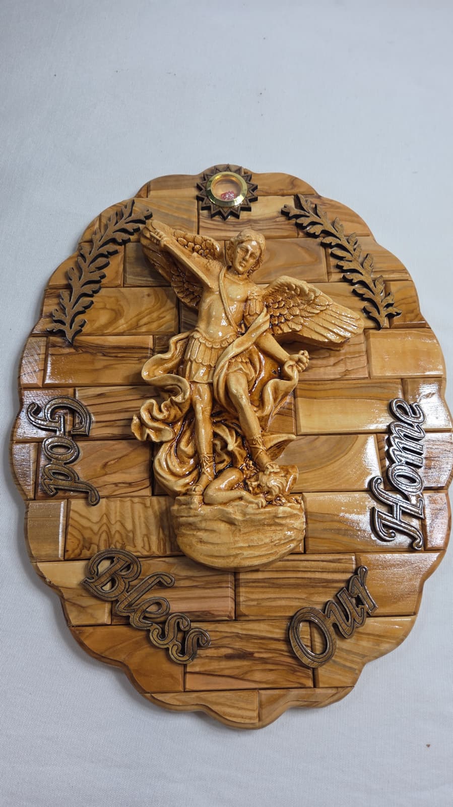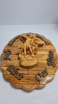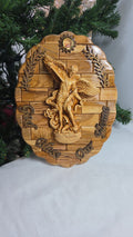 Hand-carved olive wood plaque depicting Saint Michael the Archangel. This piece is hand-carved in Bethlehem by Christian artisans using olive wood from the Holy Land. It features Saint Michael the Archangel in a scene, often depicting him defeating Satan or evil, symbolizing valor and the combat against evil. These carvings are considered pieces of Christian art and are often sought after for their spiritual significance and craftsmanship.