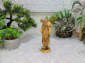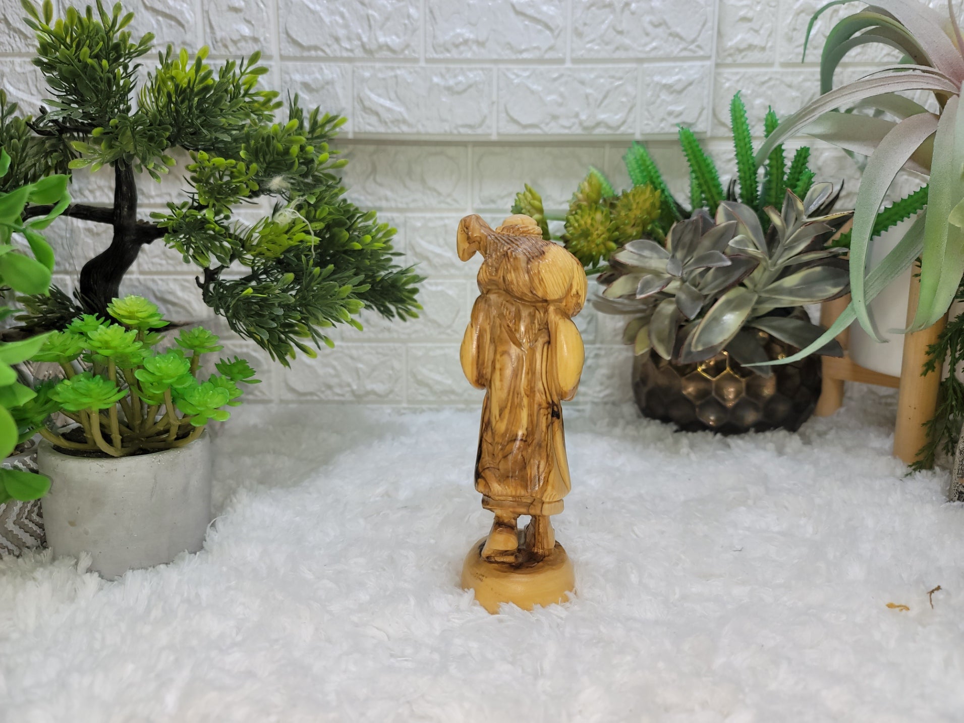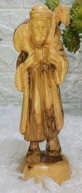 Hand-carved olive wood statue depicting the Good Shepherd carrying a lamb. This type of carving is often made in Bethlehem, in the Holy Land, using olive wood from the region. The sculpture symbolizes guidance and protection, with the shepherd representing Jesus and the lamb representing his flock. The natural grain and rich hues of the olive wood enhance the beauty of each unique piece.
