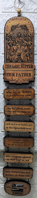 Handcrafted olive wood wall hanging featuring the Last Supper scene and the Lord's Prayer. It is made from authentic olive wood, sourced from the Holy Land. The piece displays the iconic Last Supper scene at the top. It also features sections of the Our Father (Lord's Prayer) engraved below the image. Size: 20x4x1