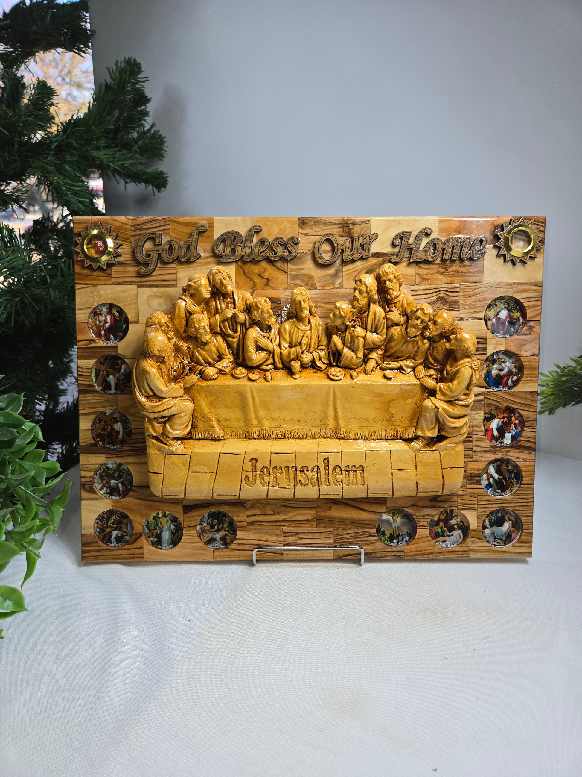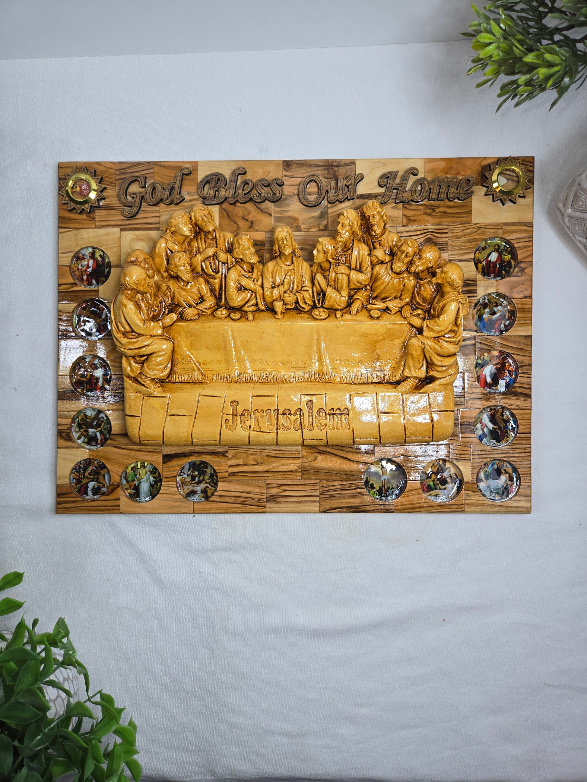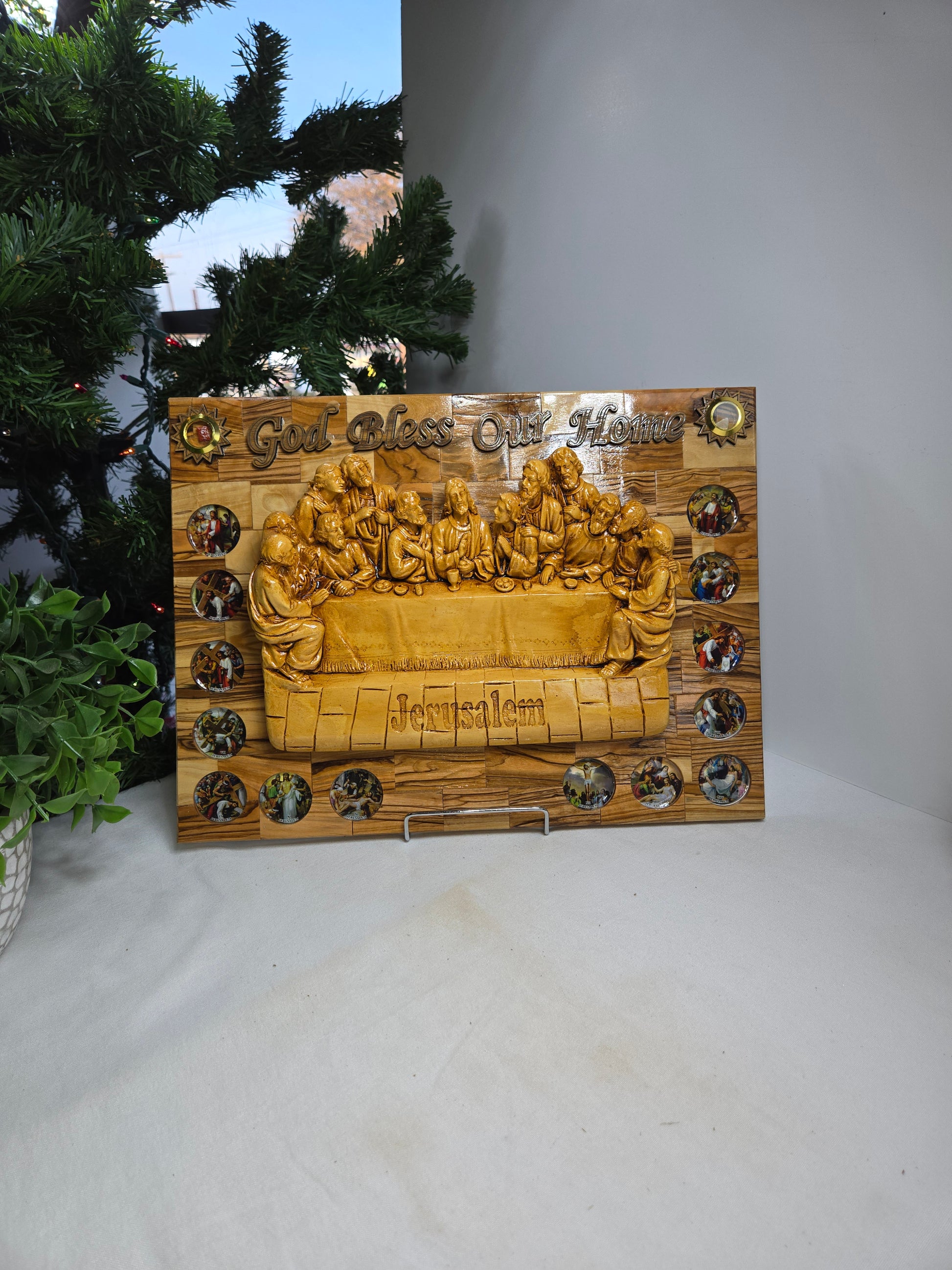 The image displays a wooden carving featuring a depiction of the Last Supper and the text of "The Lord's Prayer" (also known as "Our Father"). The prayer is partially visible, starting with "Our Father" and continuing with lines like "Hallowed be thy Name. Thy Kingdom come. Thy will be done on earth as it is in heaven". The carving also includes the word "Amen" at the end of the prayer. The overall piece a religious art or decorative item. Size: 16x12x2in