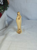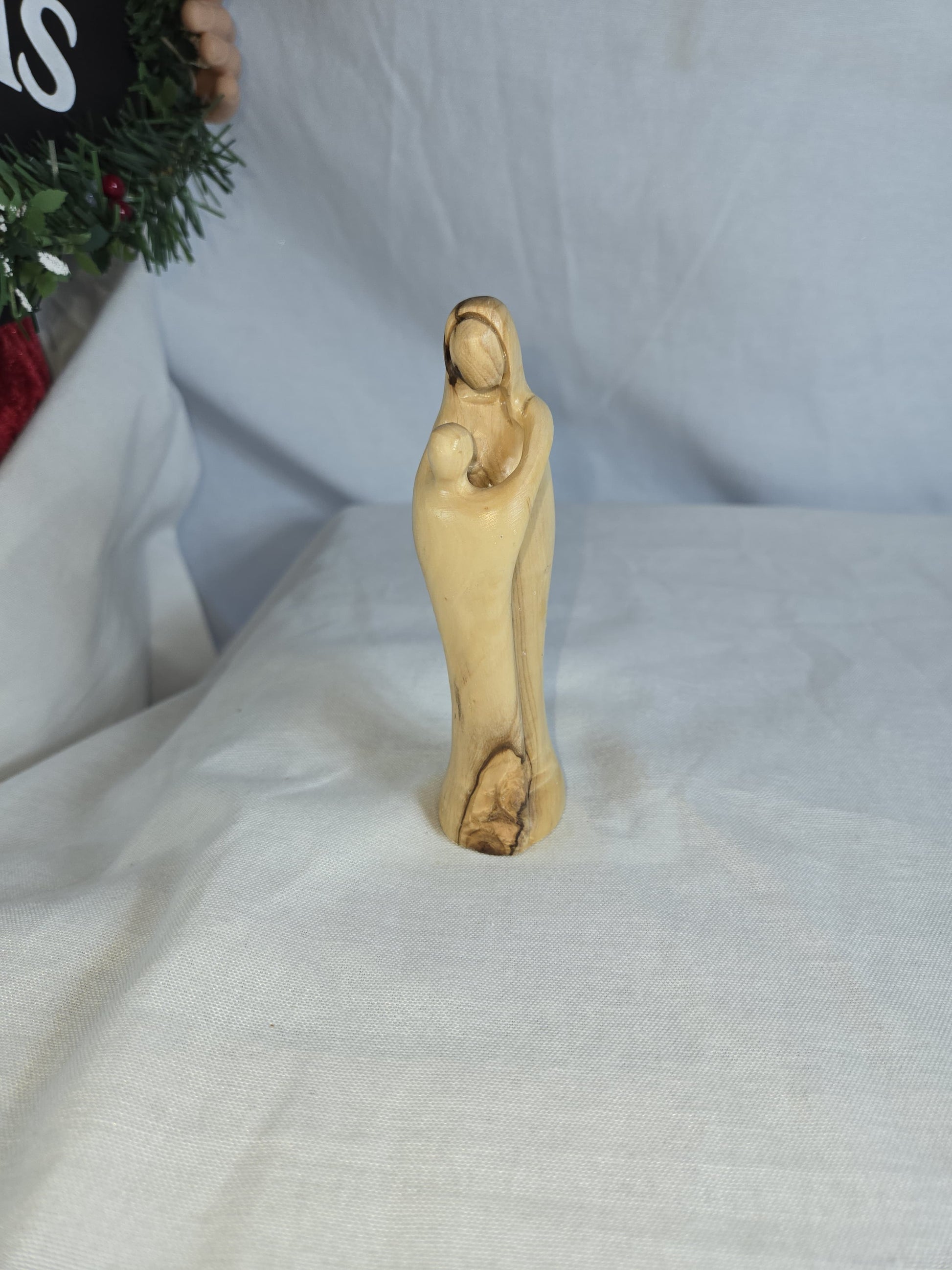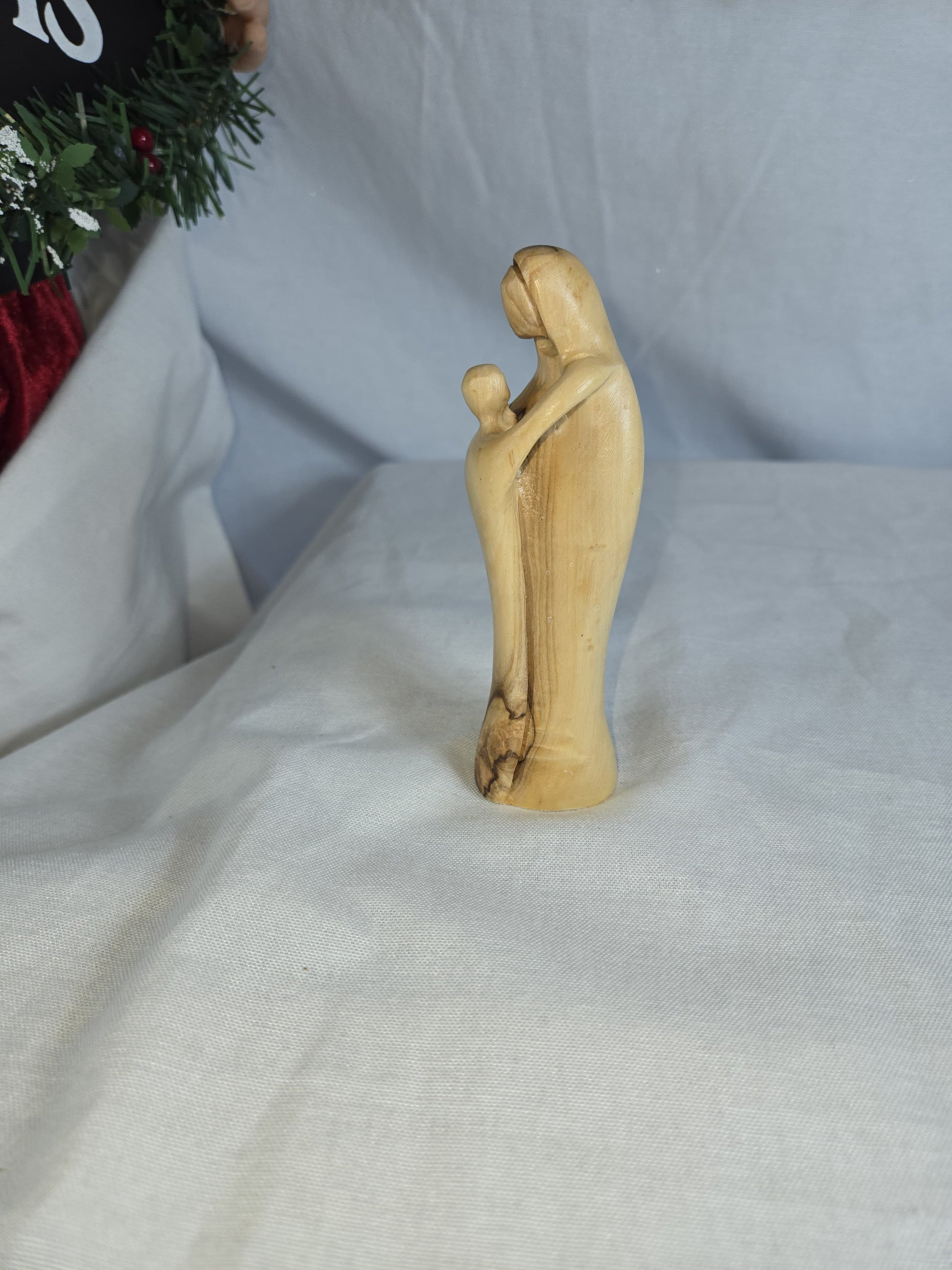 This is a hand-carved olive wood sculpture depicting the Holy Family, often featuring Mary, Joseph, and baby Jesus. Made from olive wood, known for its unique grain patterns, ensuring each piece is one-of-a-kind. Hand crafted by Christian artisans in Bethlehem, the Holy Land. Represents faith and can be a cherished heirloom, bringing a sense of divine grace to a space.