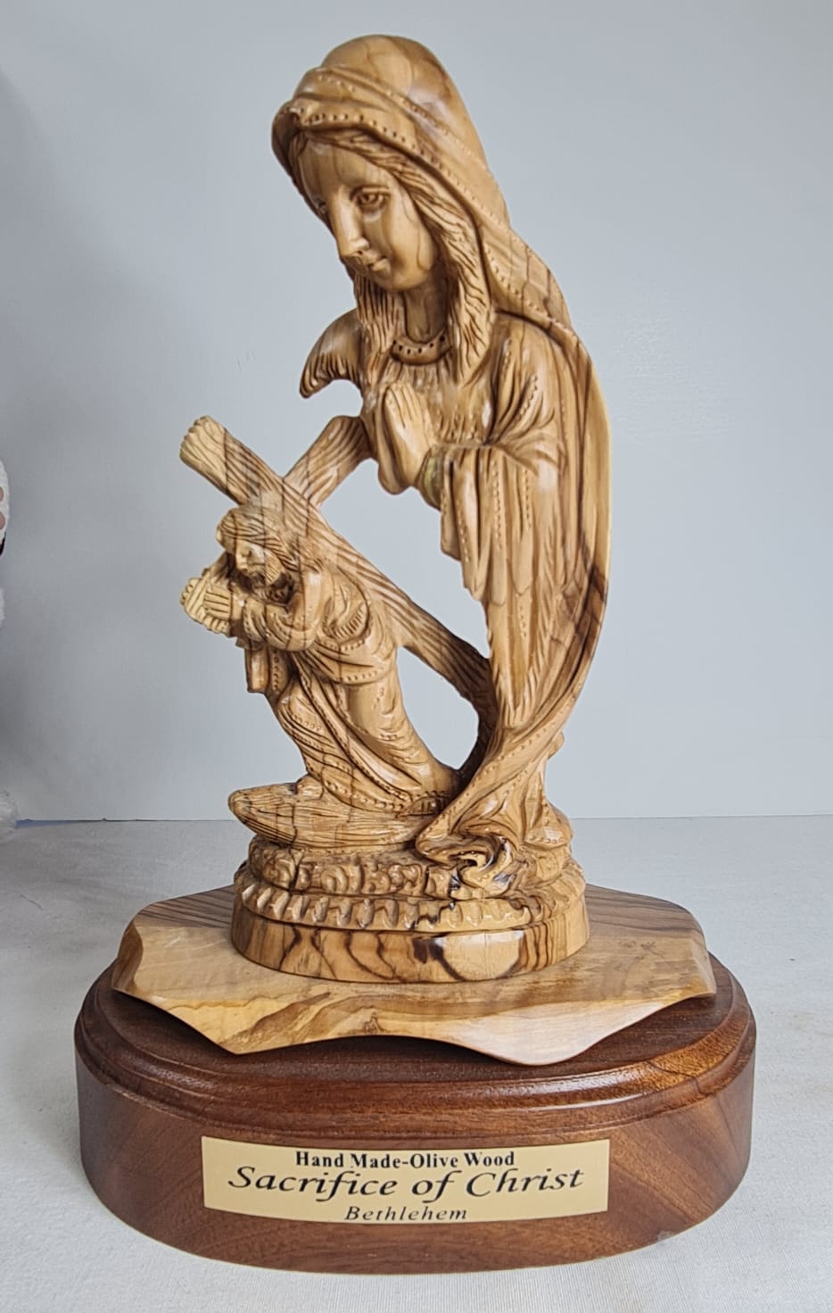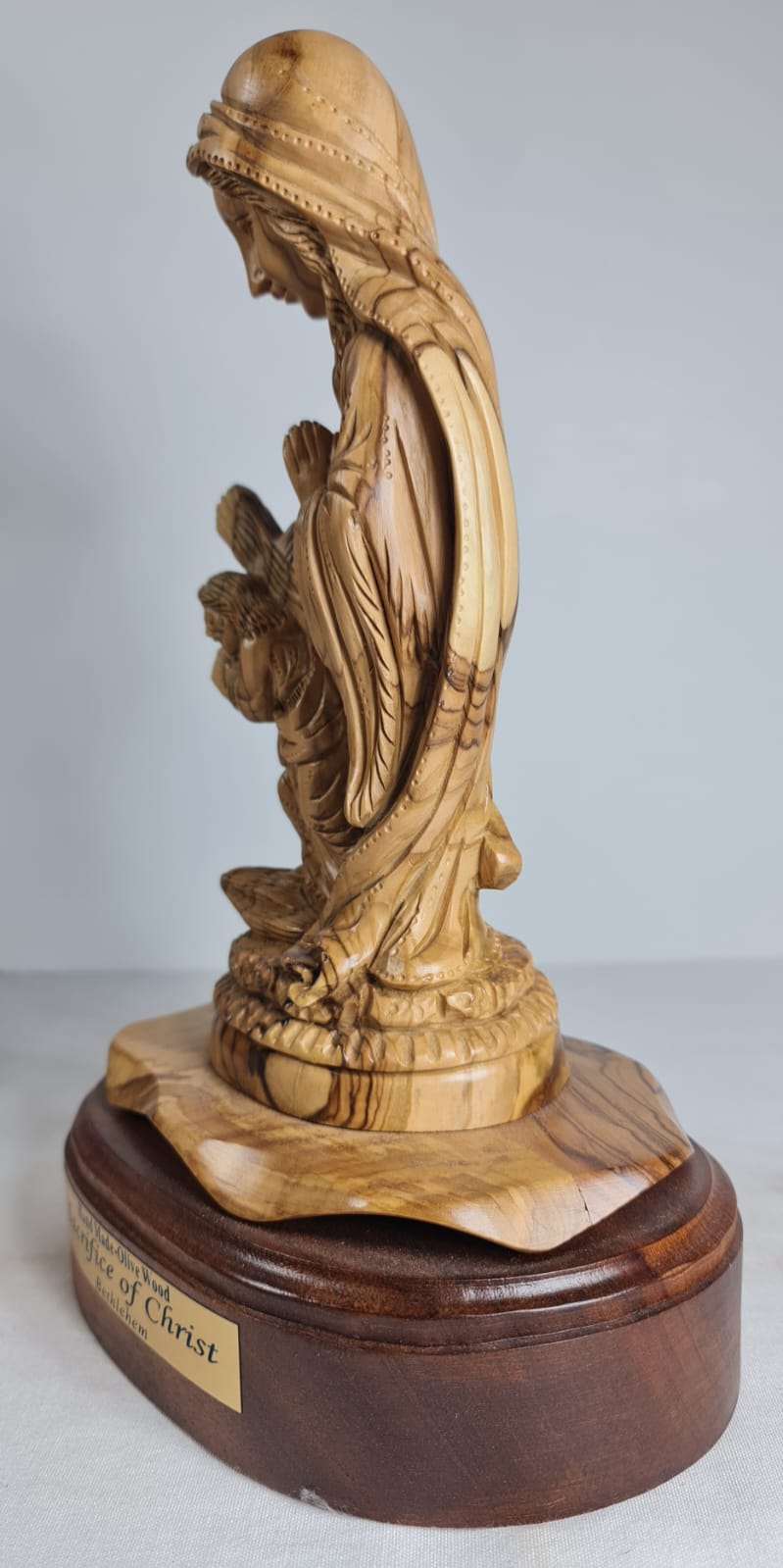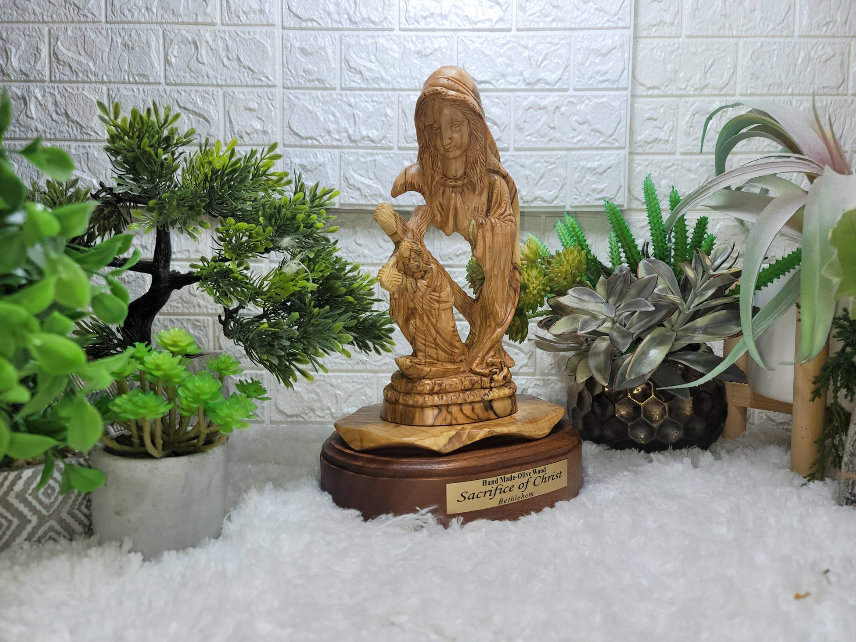 Hand-carved olive wood statue depicting the Virgin Mary holding Baby Jesus, titled "Sacrifice of Christ" and made in Bethlehem. Hand-made from authentic, sustainably harvested olive wood from the Holy Land. Represents the Virgin Mary holding Baby Jesus, symbolizing maternal love and the "Sacrifice of Christ". Carved by local artisans in Bethlehem, emphasizing its spiritual significance.
