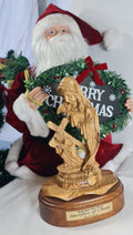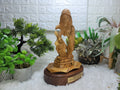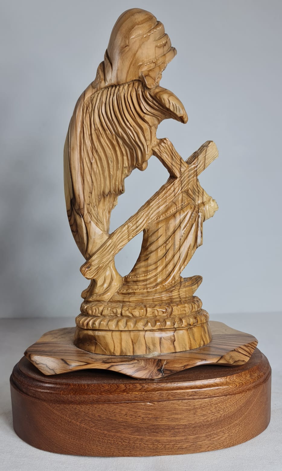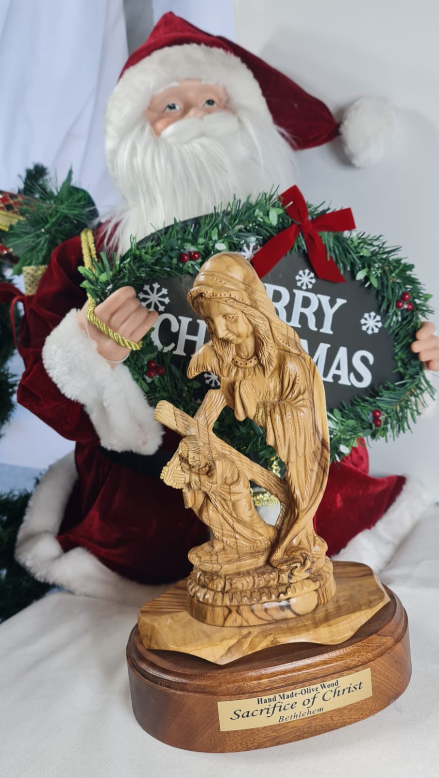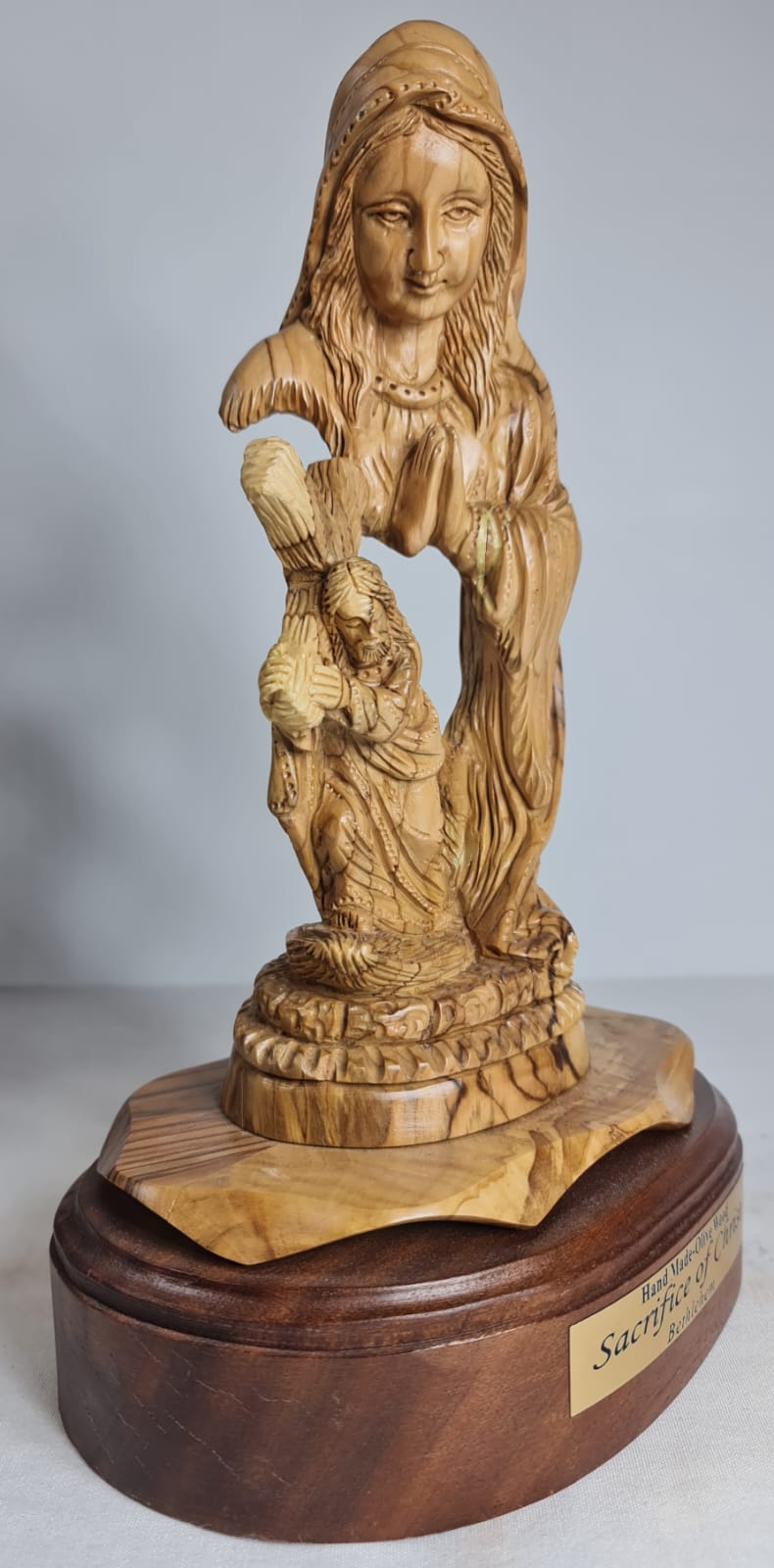 Hand-carved olive wood statue depicting the Virgin Mary holding Baby Jesus, titled "Sacrifice of Christ" and made in Bethlehem. Hand-made from authentic, sustainably harvested olive wood from the Holy Land. Represents the Virgin Mary holding Baby Jesus, symbolizing maternal love and the "Sacrifice of Christ". Carved by local artisans in Bethlehem, emphasizing its spiritual significance.